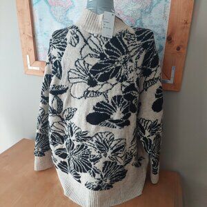 This new with tags sweater is soft and cozy. It features a mock neck and an all over black floral pattern, with solid cream cuffs and hem. Please note there is a fabric flaw as shown enlarge on last photo, but it does not take away or effect the look of the sweater when on.