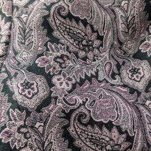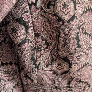 This striking Liz Claiborne blazer is a unique find, perfect for making a statement! The jacket features a beautiful purple and black jacquard paisley pattern that adds texture and depth. It's fully lined, has structured shoulder pads, and features a one-of-a-kind snap closure with decorative buttons. The two front drop-in pockets add a functional touch.