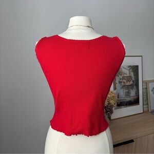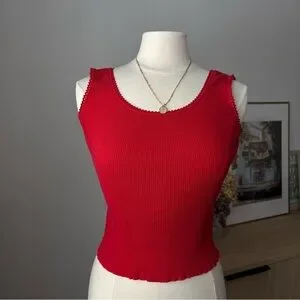 Vibrant red ribbed tank top. Sleeveless design. Perfect for layering or wearing alone.