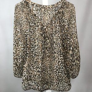 Sheer crinkle fabric blouse in leopard print. Three-quarter length sleeves with elasticized cuffs. Buttons at front neckline. Elasticized waist.