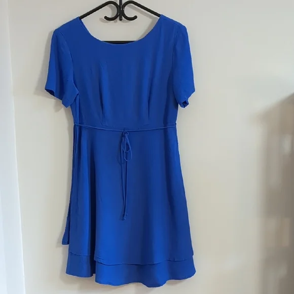 Super cute and demure blue dress by Liz Claiborne featuring a scoop neckline, short sleeves, a flattering empire waist and a flowy double layer skirt. Versatile: perfect for casual wear or work settings.