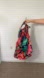 DESCRIPTION: Flowy Silky Feeling, Vibrant, Summery Sleeveless Blouse / Tank. High neck with a ruched neck hem and V cut out. Rounded hem. Bold floral pattern in orange, green, pink and blue.