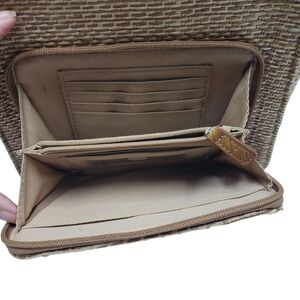 Structured tan straw shoulder bag with adjustable strap Zip close on main with a zippered pouch on back and a snap close one on the front.