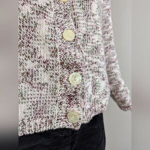 Classic and cozy Liz Claiborne cardigan in a marled mauve, ivory, and brown knit. Soft 100% cotton fabric with large iridescent buttons and a slightly cropped, flattering fit. Great layering piece for casual wear or styled with high-waisted pieces for a cozy, vintage-inspired look.