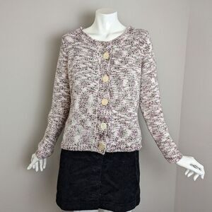 Classic and cozy Liz Claiborne cardigan in a marled mauve, ivory, and brown knit. Soft 100% cotton fabric with large iridescent buttons and a slightly cropped, flattering fit. Great layering piece for casual wear or styled with high-waisted pieces for a cozy, vintage-inspired look.
