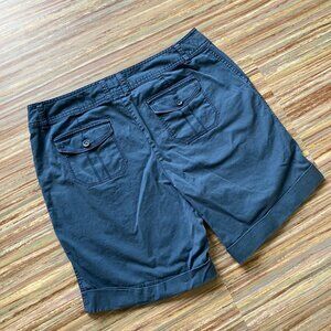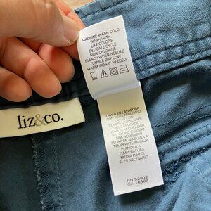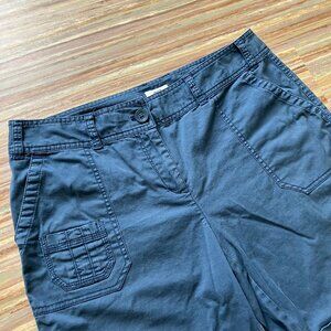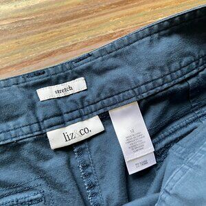 Liz & Co mid-rise shorts have large utility pockets at front with a mini pocket on the right side. Back pockets have flaps that button closed. Blue 97% cotton/3% spandex fabric. Tag size is women's "12", fits 34" waist, see below for garment measurements. Pre-owned condition: some fading to fabric from normal wash/wear.
