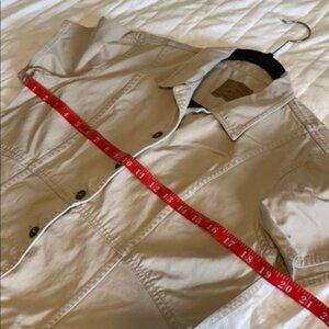 Lizwear by Liz Claiborne denim dress. Full button front and pockets. Size and material tags have been removed, but fits like a small. There is a small stain in the front near 4th button down but very faint. Color difference due to lighting. Its a light tan.