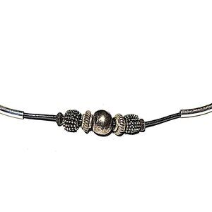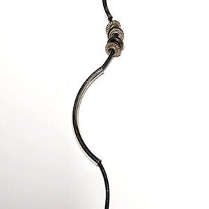 Lizzy James minimalist silver metal tube necklace mounted on very dark gunmetal gray cording which looks black in certain lighting