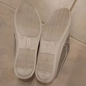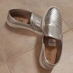 Perforated silver faux leather loafers