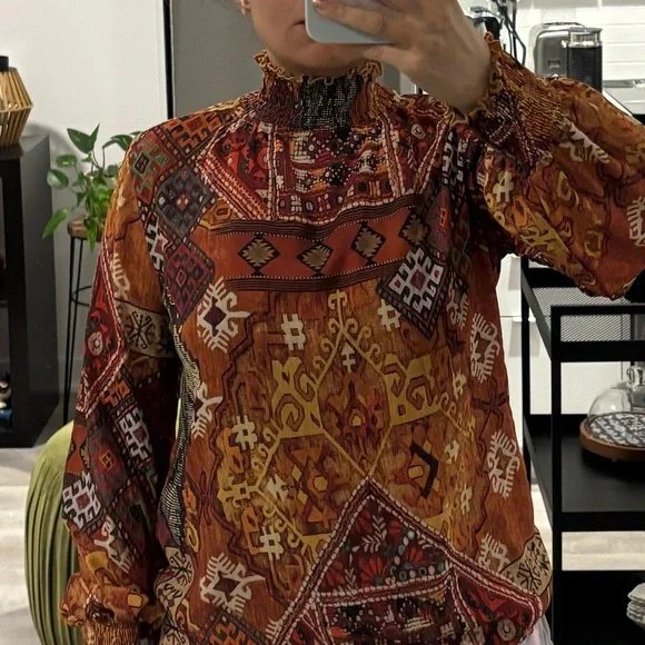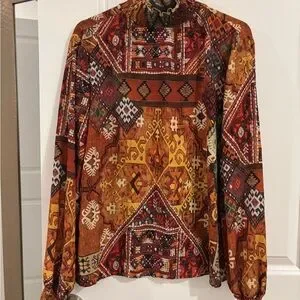 Vibrant blouse with intricate patterns. Features rich hues and a high neckline. Perfect for a statement look in Fall or Thanksgiving 😍😍😍like new condition ♥️