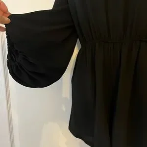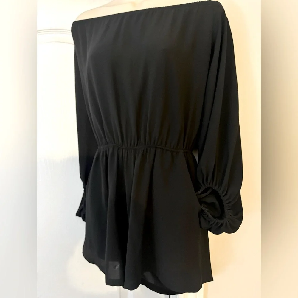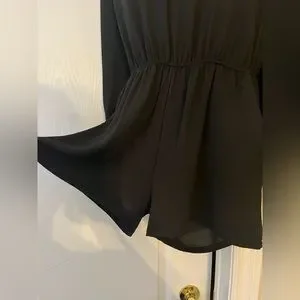 Black jumper shorts, off the shoulder 97% polyester and 3%span. Can be dressy and casual. Very cute. Size large