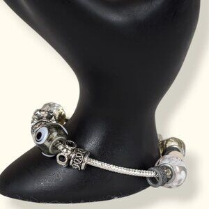This bracelet is made of a silver tone metal and has a locking Pandora-style closure. Though the bracelet is very similar to charm bracelets by Pandora, there is no maker's stamp indicating a maker, and there is no stamp indicating metal content (which, for Pandora, would be S925). The bracelet comes with 18 charms in a variety of styles, sizes, and materials. Some are glass, some have rhinestones, some are metal with Celtic triquetra-style patterns, and some are a little more plain. Pic 2 gives a good overview of all the beads included. There is normal wear in both the bracelet and the charms, but no issues affecting wearability.