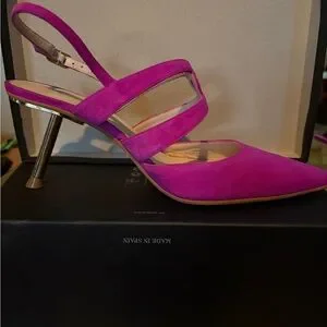 Made in Spain fuscia suede slingbacks with angled gold heel.