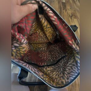 Sleek and stylish design. Perfect for daily use. Features durable handles and secure zip closure. Cute floral print inside