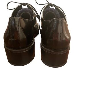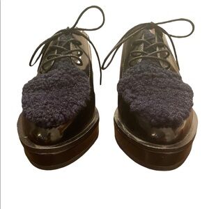 Euc Loeffler Randall Frances oxfords in size 6.5. Black leather with navy shearling. Covered wedge and platform. Lace-up closure. Rubber sole.