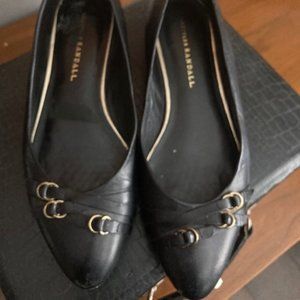 Black ballet flats with criss-cross leather detail at toes and gold tone accents. In good condition. Minor scuff at toe. See photos for heel and sole condition.