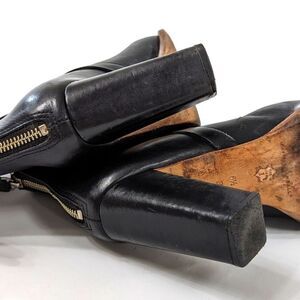 Light wear to the sole with light imperceptible scuffing on heel (well pictured). Otherwise no flaws. Center back heavy duty chrome zip, leather wrapped heel.