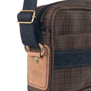 Made in Italy, this shoulder bag from Loewe is crafted in a brown houndstooth canvas, and features tonal leather trim, gold-tone hardware, navy webbed trim, an adjustable shoulder strap, a front slip pocket with an embossed logo, and a top zip closure that opens to a tan logo-jacquard interior.