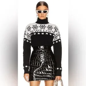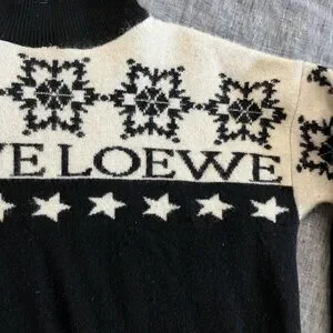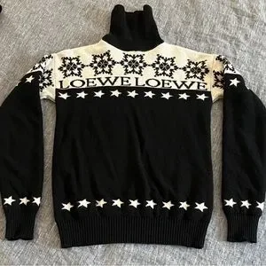 Loewe black and white turtleneck sweater featuring snowflake star patterns, and the brand-name across the chest.