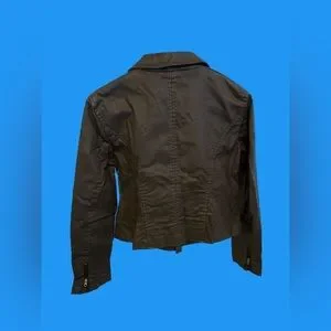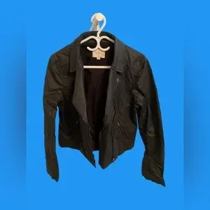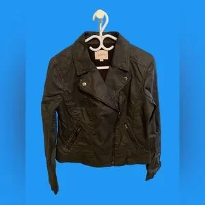 Fashion faux leather jacket. Full zipper with snap buttons. Stitch design by underarms. Has 2 front pockets that are zipper closure. Polyester lining, has good stretch. Gently used, in good condition. Pit to pit measures 20”