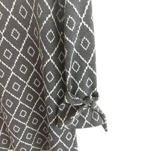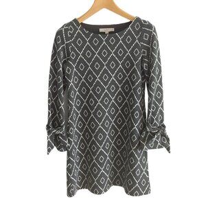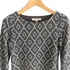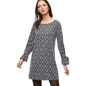 This is a long sleeve knit shift dress in a grey and white geometric diamond pattern by Ann Taylor LOFT.