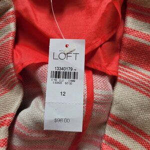 Ann Taylor Loft blazer. New with tags. Pink and tan stripes. Mock pockets. It is marked a size 12. 2 brown plastic buttons. Decorative buttons at the cuffs. Shell is 68% linen and 32% rayon. The back is 100% cotton. The lining is 100% acetate.