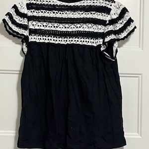We're smitten with this flowy soft knit top, fluttering from a wanderlust - chic crochet yoke. Round neck Cap flutter sleeves., Imported:, Fit: Classic follows your contours with a little room, Length: Regular - hits below natural waist, Fabrication: 100% Cotton, Garment Care: Machine Washable Loft Crochet Ruffle Sleeve Black Women's by Loft Size Large 100%, Cotton Crew Neck Short Sleeve Blouse Tops Everyday 100% Cotton Machine Washable