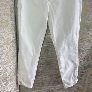 - LOFT Skinny Crop Jeans Off white (not quite bright white) Ruched/gathered bottom Cotton blend. Button Zip Closure ,5 Pocket Design With Belt Loops .