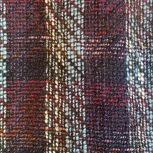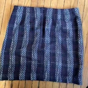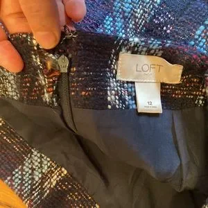 Lovely plaid-like fabric. Blue, purple, red, orange. Some minor damage on the inside around the zipper (see photo with finger) but nothing that is visible outside. Size 12.