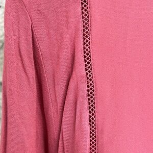 Dark dusty rose long sleeve top. It has knit sleeves and side panels and chiffon front and back. Small button at back of neck and elastic cuffs. True colour in last two pics.