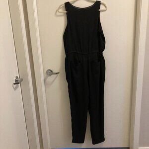 Loft by Ann Taylor classy black romper. Cute detailing along sides, tie at waist and pockets! The hem on one leg needs to be tacked (see picture)