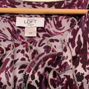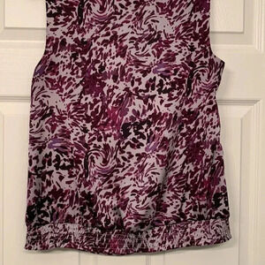 Pretty sleeveless blouse with ruffles on chest and elastic waist. Silver grey with purple. Size Medium Petite. In immaculate condition.