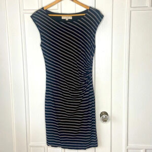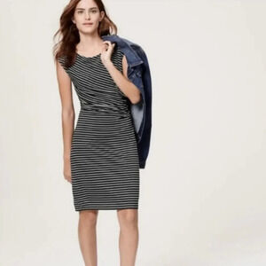 Loft Size Med Black And White Stripe Stretch Knit Sheath Dress Black and white stripe, crew neck, sleeveless, ruching at side. Fully lined SP Small petite Excellent preloved condition