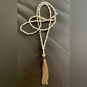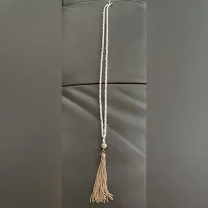 This gorgeous necklace has gold and white coloured stones with a gold tassel. It’s a great statement piece.