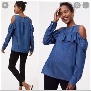 Loft blue chambray linen blend, ruffle front long sleeve blouse with cut out shoulders. Ladies XSP petite.