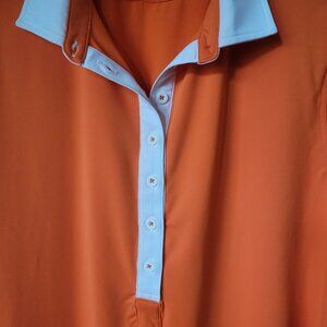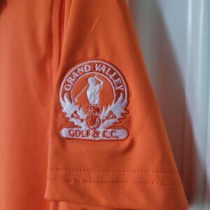 Loft8, NWOT, Size XL, branded, orange coloured button down golf shirt, with white collar and button placket, slits at sides per pics. Branded to Grand Valley G & CC.
