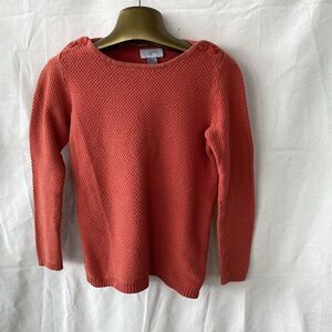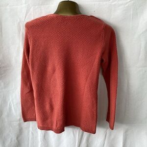 Button detail at neck, salmon pink orange colour, long sleeve, round neck, cotton, EUC, neck to hem 23”, armpit to armpit 17”, armpit to cuff 16”.