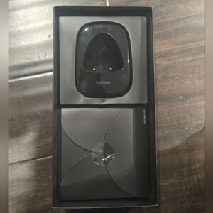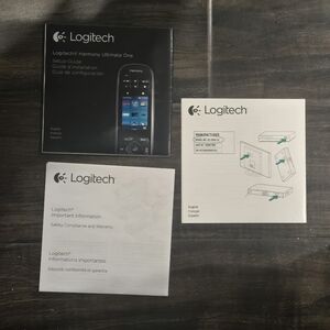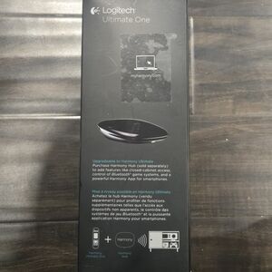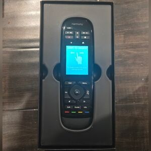 The Logitech Harmony Ultimate One is a premium universal remote featuring a slim, ergonomic design defined by a 2.4-inch color touchscreen that supports swipe-and-tap gestures for controlling up to 15 home theater devices. Its unique button layout places transport controls (Play, Pause, Record) at the top, while the backlit navigation buttons, volume rockers, and a central directional pad are situated below the screen for easier thumb access. The device includes haptic feedback to provide tactile vibrations during touch interactions and utilizes an internal rechargeable battery, typically paired with a dedicated vertical charging cradle to ensure it is always powered for use.