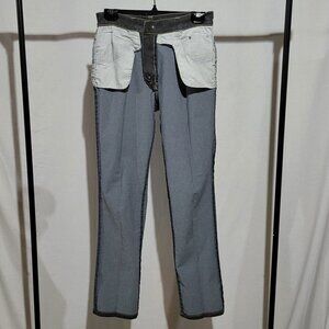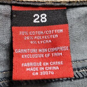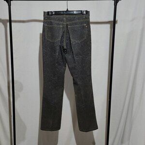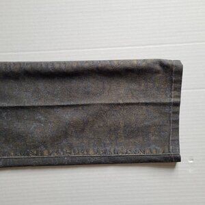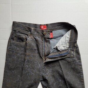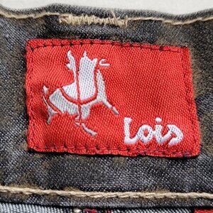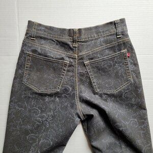 Lois jeans. Black with a paisley style pattern in grey and brown. Waist and back pockets. Button and zipper. Belt loops. Marked a size 28. 70% cotton, 25% polyester and 5% Lycra. Stretchy! There are not any stains, tears or holes. Very good, gently used condition.