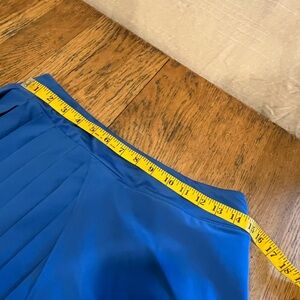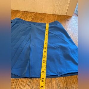 Dynamic blue pleated skort by Lolë, designed with a flattering crossover waistband and built-in shorts for confidence and comfort during activity. The clean silhouette and functional style make it perfect for golf, tennis, or city strolls.
