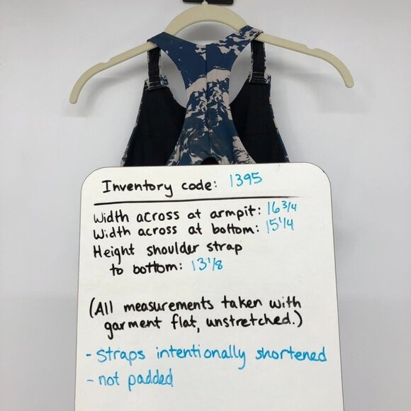 *the straps have been shortened by the previous owner, about 1”, this left some exposed lines of white sewing/thread and makes the sports bra fit a bit tighter, with a bit more support*