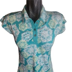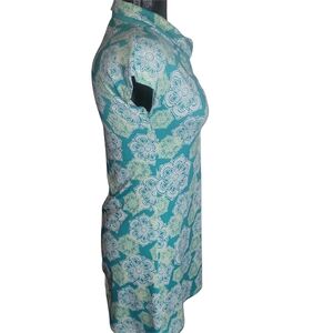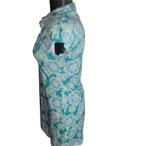 Elevate your style with this chic teal and white dress featuring a beautiful floral pattern. Collared with 3 button neckline and short sleeves.