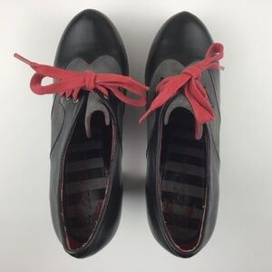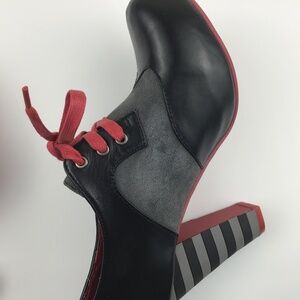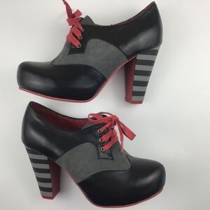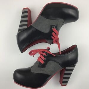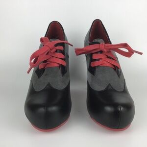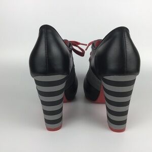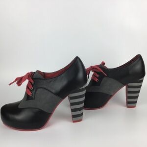 Eclectic heels by Designer Lola Romana with black leather and grey suede, pink laces, and a striped black and grey 4” heel.