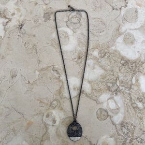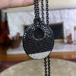 In excellent preowned condition stunning Lola and Grace 36” long necklace featuring a gorgeous black & white oval disc pendant encrusted with Swarovski elements crystals.