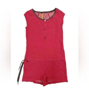 The romper has a drawstring waist and a faux fly. There are snaps to close this garmet and it features two flat pockets. Made from natural fibre, with a UFP 50, this stretchy romper is a summer staple.