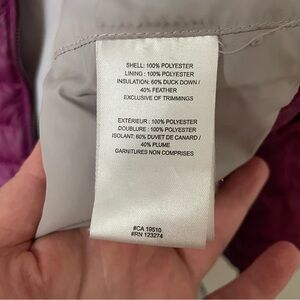 Lole Down Filled Hooded Longline Puffer Coat Jacket Magenta Size Medium. Zipper closure and pockets. 60% duck down, 40% feathers. Water resistant polyester shell. Super warm and cozy. Size medium. Good used condition, some signs of wear (discolouration) around sleeves.