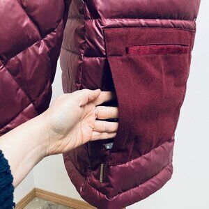 Lole brand quilted coat is insulated with 90% down/10% feather for lightweight warmth. A deep merlot burgundy red color with velvet trim around the neck and front pockets. Large front pockets in a contrast woven fabric have top openings + separate side openings with zip closures, single inner pocket with zip closure. Two-way front zipper. 100% polyester outer shell & lining, machine washable cold, tumble dry at low heat setting. New without tag (has not been worn).