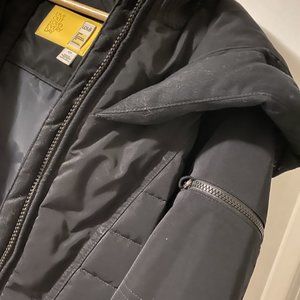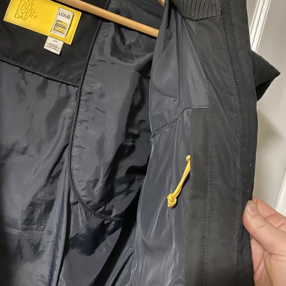 Gently used black winter coat by Lole, in good condition. This coat has a really nice fit and nice details. It has a heavy quality feel, good zippers, a zippered interior breast pocket, and two zippered exterior pockets. Big hood. 70% down filling. 1-inch area around side of bottom trim that needs a minor repair (pictured). It pains me to get rid of it but, like everything else, it is too small for me now. Asking $75, open to reasonable offers.