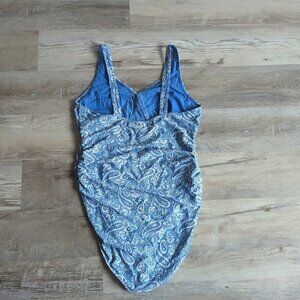 This is a blue and white paisley print one piece swimsuit by Lole.