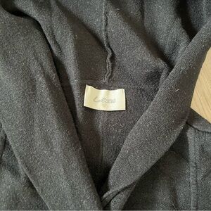 Elegant jacket with a cozy hood. Ideal for layering. Thick but soft knit with great stretch. Button up, split back seam is extremely flattering. Long style, can be worn as a light jacket.